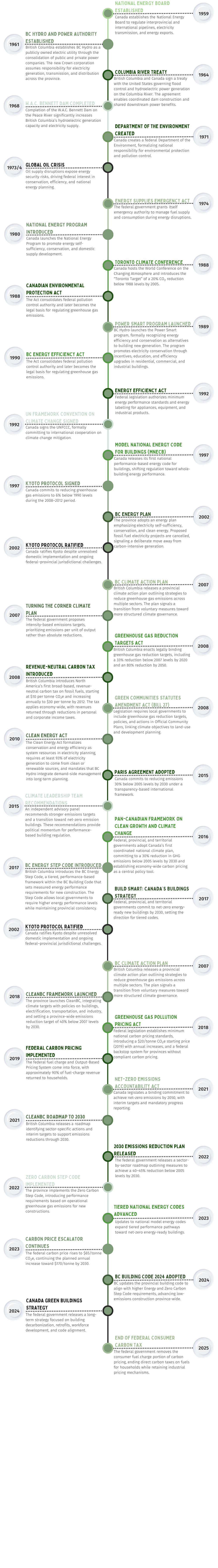 This timeline traces the evolution of energy efficiency and climate change policy in Canada and British Columbia—from early energy regulation to today’s net-zero and climate action frameworks. It highlights key federal and provincial milestones that have shaped building performance, emissions reduction, and energy policy over time.